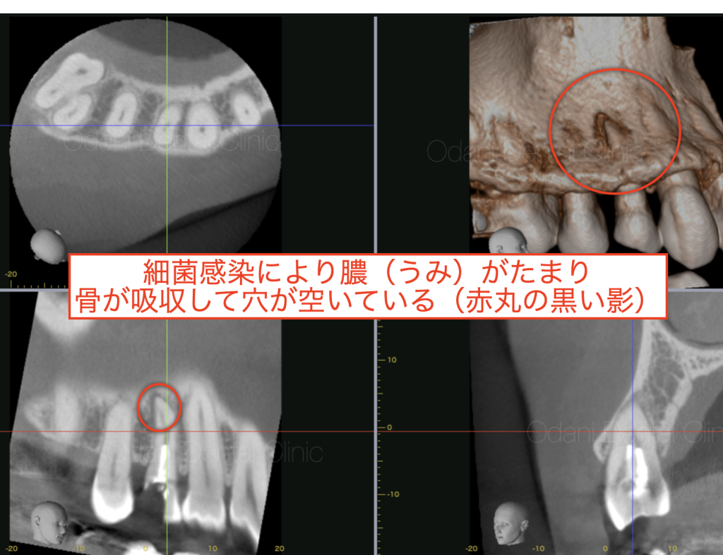 CT画像では、歯の根の周囲の骨が少し吸収していることが確認でき、このまま放置すると、さらに感染が進行し、骨の吸収が拡大する可能性が高いと考えられました。
