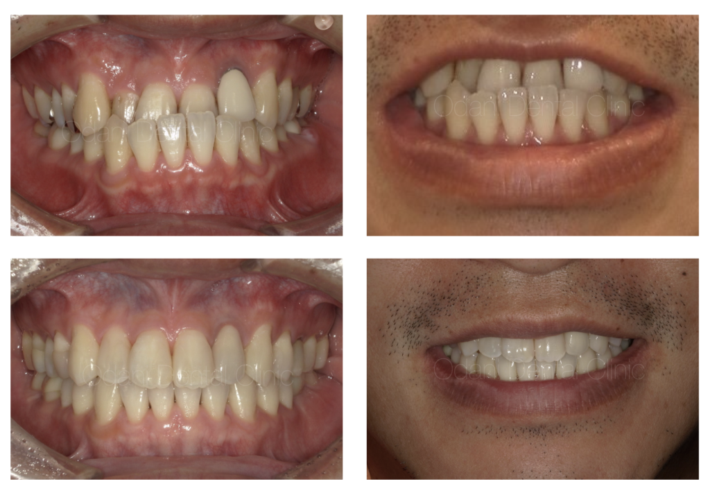 まず虫歯や根の問題をクリアした上で矯正治療によって噛み合わせを整え、その後インプラント治療と最終のかぶせ治療を行う