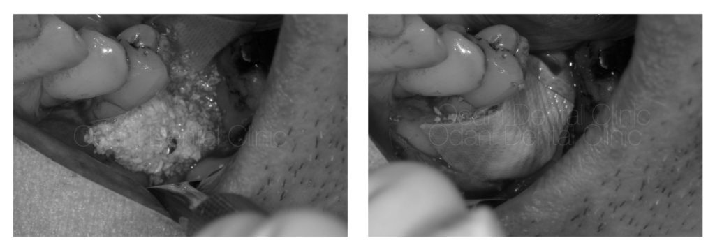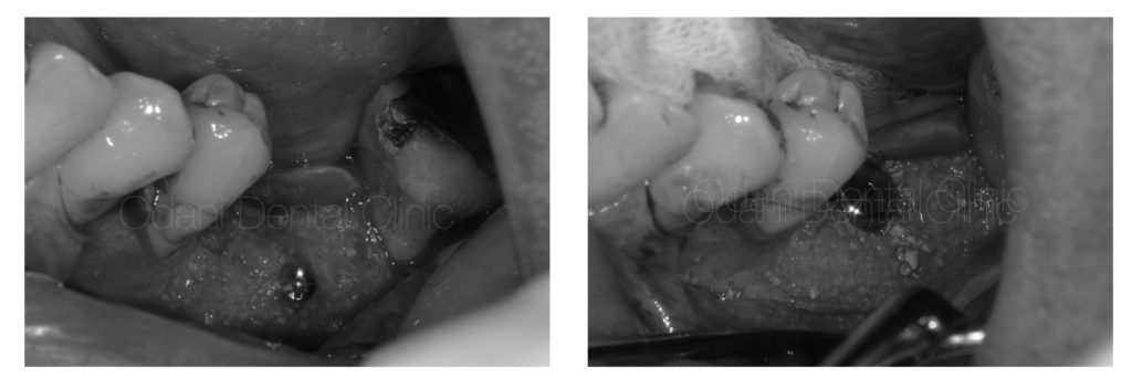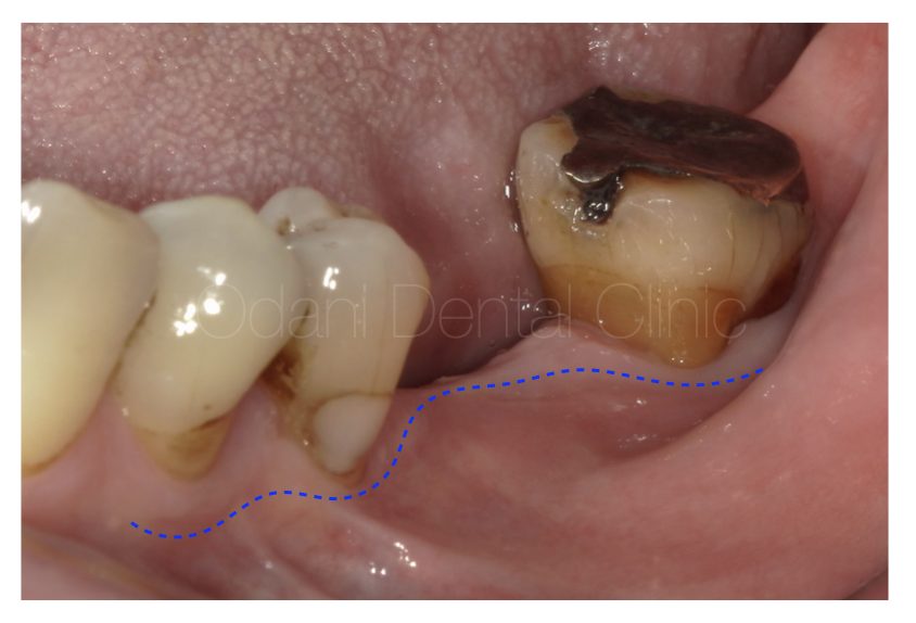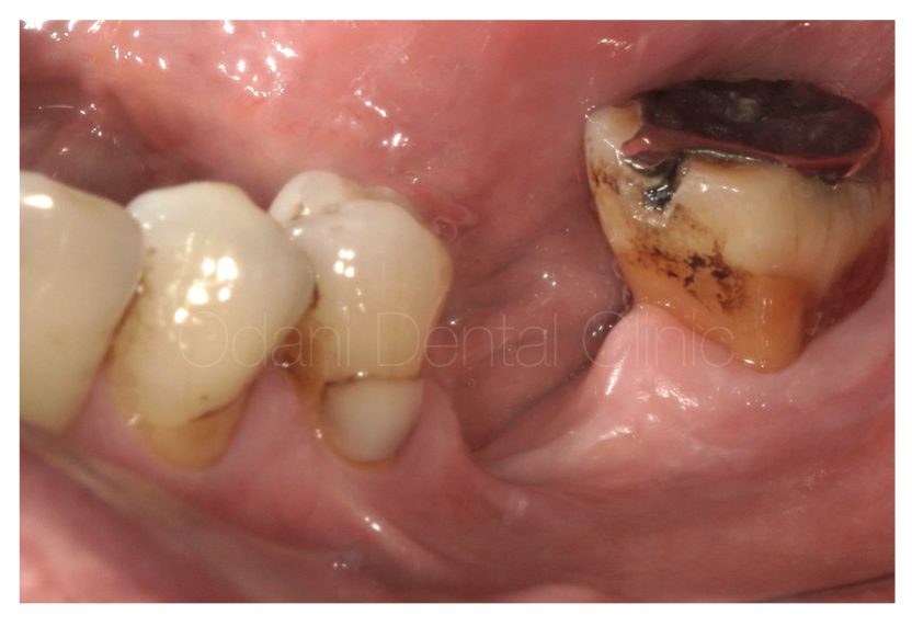 写真の患者様はもともと大きく骨が不足していたため、インプラントを埋め込めない状態でした。まずは骨を作ってから骨が固まるのを待って改めてインプラント埋入を行うこととしました。一番奥の歯も予後不良でありましたが、この骨造成のためには一時的に保存した方が骨が作りやすいと判断し一旦は保存しております。