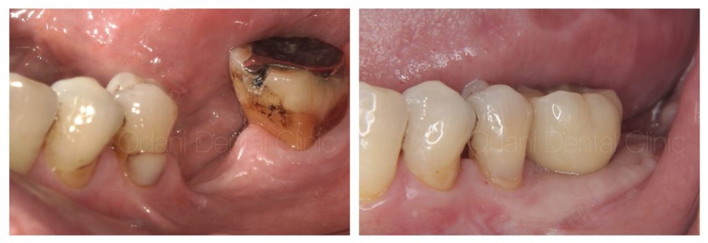 最終的に予後不良の一番奥の歯は抜歯し、結果としてインプラントがより清掃しやすい環境となりました。