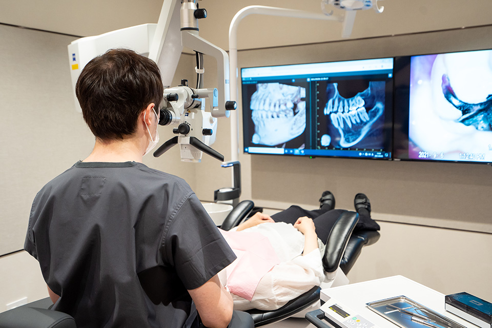 歯髄の露出部位は0.5mmにも満たないことが多く、肉眼で視認するのは極めて困難です。そのため当院では、歯髄温存療法を行う際には、マイクロスコープを活用します。術野が30倍程度にまで拡大されることから、精密かつ安全な治療が可能となります。