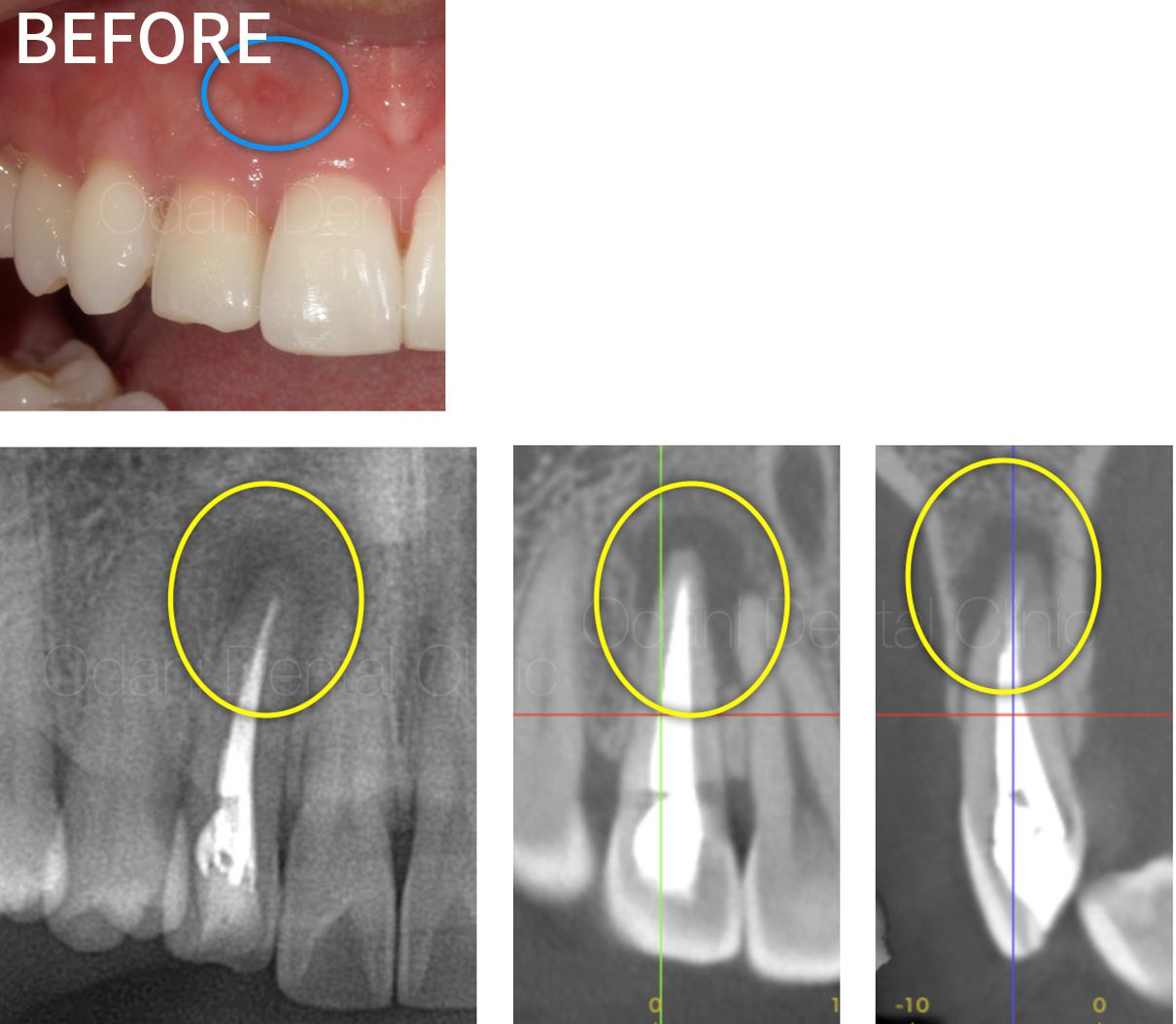 感染根管治療(再治療) ラバーダム防湿を行い、唾液の侵入のない環境づくりを行った上で、周囲をよく消毒してから、30倍まで拡大できるマイクロスコープ下で、根管内に詰まっていた詰め物や汚れを除去後に清掃・洗浄を丁寧に行いました。洗浄には、薬剤や超音波洗浄に加え、超弾性ニッケルチタンファイルやEr:YAGレーザーも併用し、根管内の細菌除去を徹底し、根管充填(根の中の詰め物)を行いました。 |