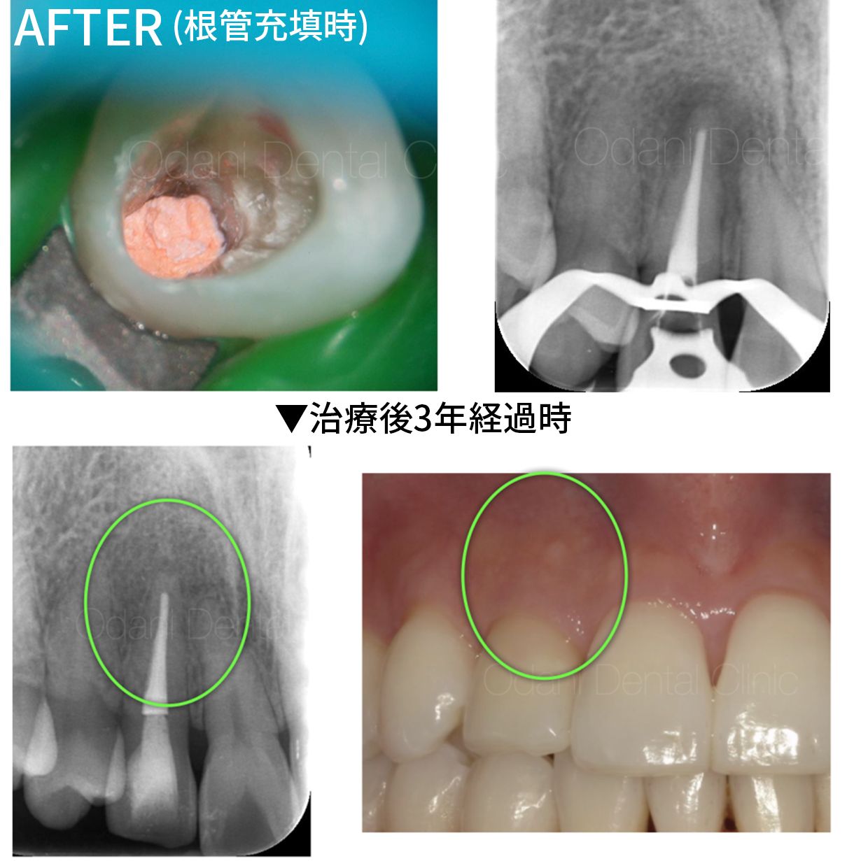 治療後に一時的な痛みや違和感が出ることがあります。 根の病気が再発する可能性があります。 歯の変色が進んでいく可能性があります。 再発した場合、外科的な根管治療が必要になることがあります。 |